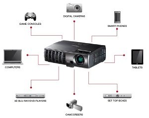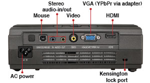 The HDMI port allows this DLP projector to connect readily to the broadest possible range of devices, including, but not limited to: laptop computers, tablet computers, smart phones, Blu-ray and DVD players, and gaming consoles. An included IR remote control with mouse control makes presentations easier than ever.